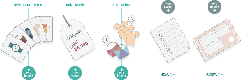 商品一括登録、価格一括変更、在庫一括更新に対応しています。