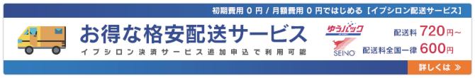 各種クレジットカードに加え、コンビニ決済や、電子マネー・ネット銀行といった幅広いサービスまで対応できるのは、大手決済代行サービス「イプシロン」の魅力。さらに、イプシロン追加申し込みで格安配送サービスも利用可能です。初期費用や月額費用は無料、配送料は市場価格よりも安い、ゆうパック720円〜と大幅に配送コストを削減できます。 詳しくはコチラ>>