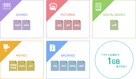 ※ 登録できるファイルはアーカイブファイル( zip, msi, dmg, apk )、音源(mp3, wav)、画像( jpg, gif, png )、PDFファイル、動画( mpeg, mpg, mp4, avi )です。