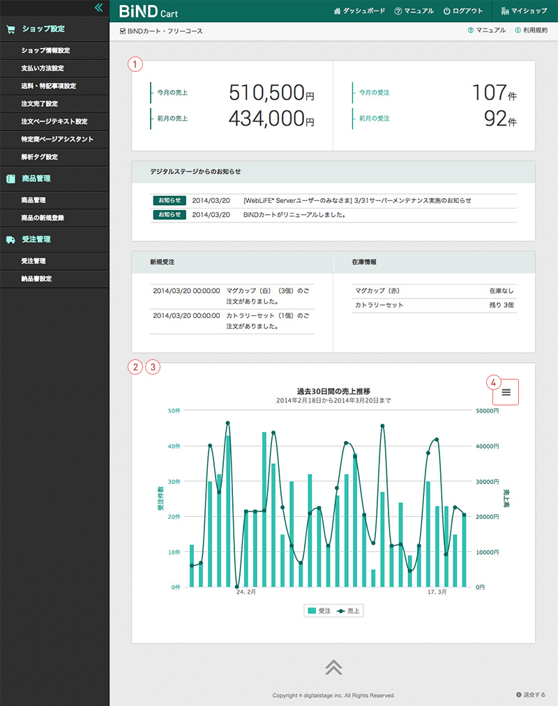 新規の注文や在庫状況も、管理画面で素早く分かるダッシュボードが、スムーズな運営を手助けする秘密。